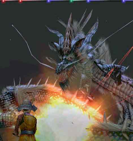 結界クエストの四神を模ったモンスターとの戦いです。やっぱりこのサイズのボスキャラというのはインパクトがあります。中でも東の結界を守る青龍。ネズミや蛇を狩っている昨今、刺激があります。