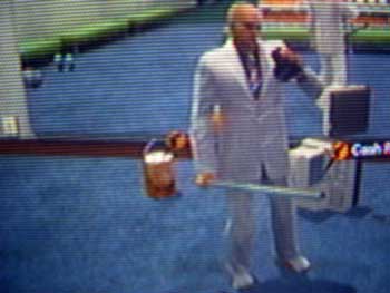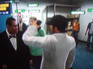 2周目なので多少タフになったことを利用してガンショップの男に近づきます。カウンター前で鉄パイプ殴打。攻撃力も上がっているので順調にゲージを減らすことが出来ます。しばらくすると、男がカウンターを移動。移動したら、殴るタイミングが変わってしまい、空振り~、その後すぐに銃撃を食らって吹っ飛ばされる。また近づけなくなった(゚゚;)