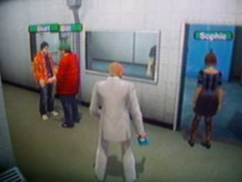追いかけていると、サッカーボールの上で立ち往生しているおばあちゃんと、化粧品屋に男がのんびり立っています。